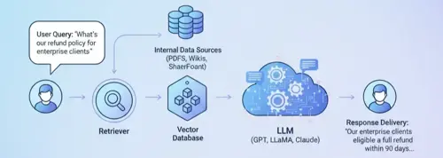 - User Query: The process starts when a user asks a question — for example, “What’s our refund policy for enterprise clients?”